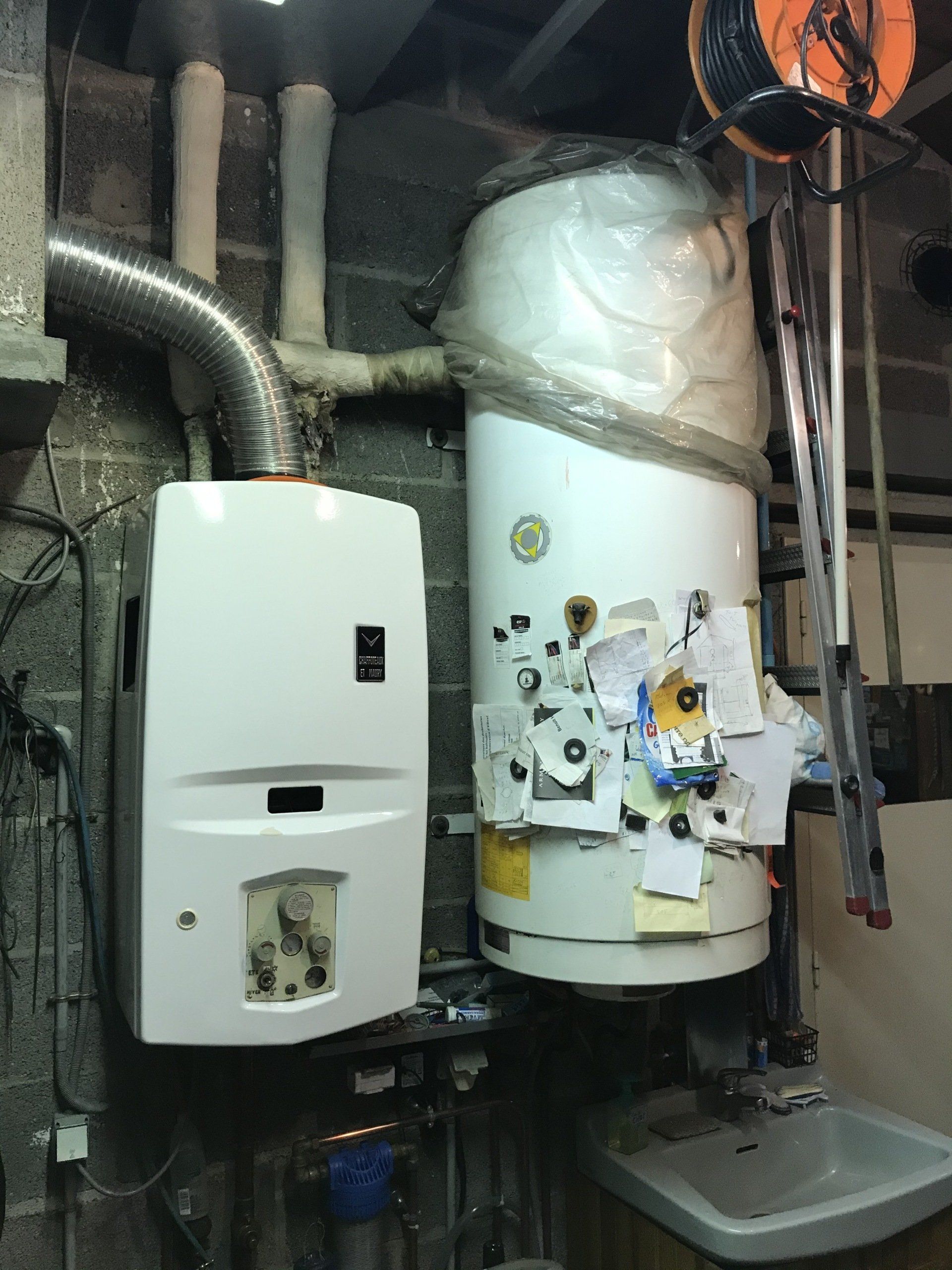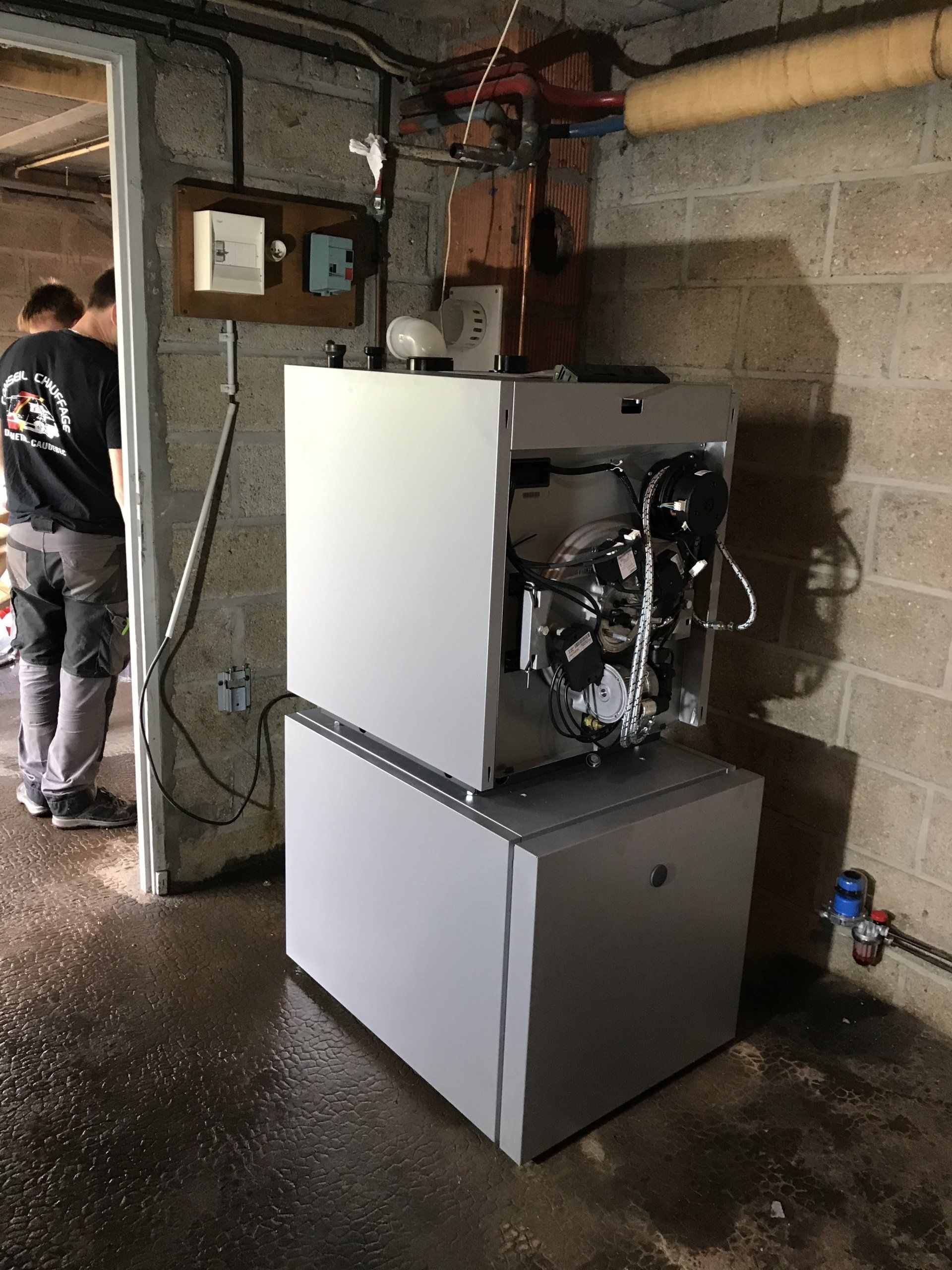 Ci-dessus un avant/après d'une installation de chaudière VIESSMANN type Vitodens 111 W gaz condensation cheminée 26 kw .