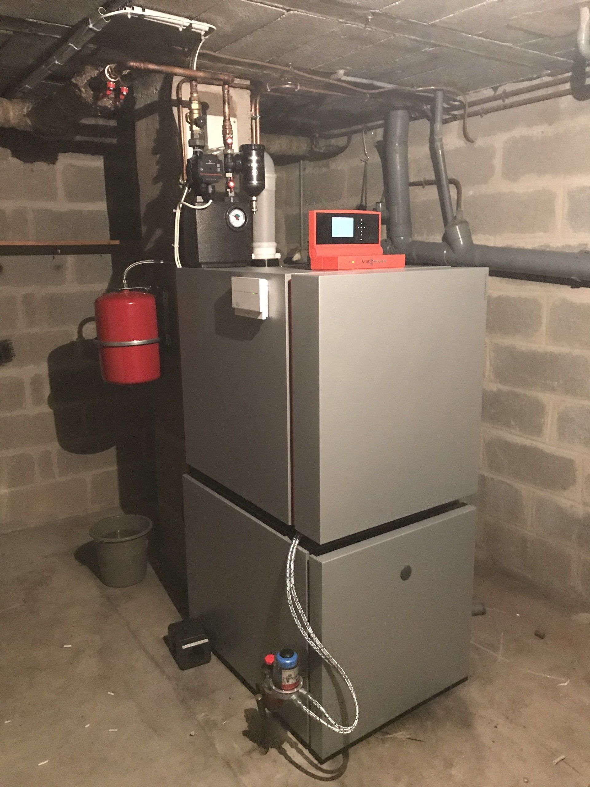 Ci dessus un avant/après d'un remplacement de chaudière fuel classique par une chaudière fuel de marque VIESSMANN type Vitoladens 300 C Très Haute Performance Énergétique (à condensation) gestion par tableau de régulation Vitotronic 200, sonde extérieur et sonde d'ambiance Vitotrol 200.